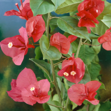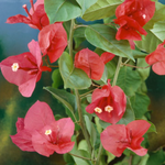 Bougainvillea Scarlet O'Hara is a vigorous evergreen climber with a profusion of orange bracts with dark red shading. The flowers are displayed from October to May. Bougainvilleas are colourful semi-deciduous vines with long-lasting flowers that add a tropical feel to any garden setting. Ideal for climbing over garden structures and for screening walls and fences. Prune after flowering to promote fresh new growth and continuous blooms.