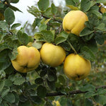 Smyrna is a Turkish variety of quince with large, fragrant, bright yellow fruit. It has dark green foliage and masses of small pink-white flowers before fruiting. The fruit, with its pale yellow flesh, is one of the few that must be cooked as it is too tart, hard and unpalatable to eat raw, and is perfect for jam, cider, chutneys and sauces. Smyrna is self-pollinating. Ideal for orchards and edible or cottage gardens.