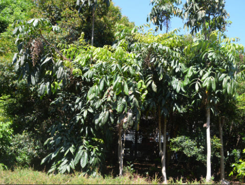 Davidsonia pruriens, commonly known as the Davidson Plum, is a medium-sized rainforest tree native to northern Queensland. It features large, attractive compound leaves and produces clusters of small, deep pink to red flowers, which are followed by striking plum-like fruit. The fruits, though too sour to eat raw, are prized for making jams, sauces, and preserves. One of the tree’s most fascinating characteristics is its cauliflorous habitβ€”the flowers and fruit are borne directly on the trunk, adding strong ornamental appeal. When ripe, the fruit’s flesh turns a rich red and often falls to the ground, remaining largely unbruised and ready for harvest straight from the rainforest floor. An excellent specimen tree for subtropical and tropical gardens, combining decorative foliage and unique fruiting habit with practical culinary value.