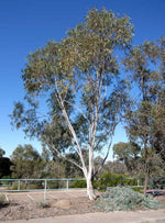 Eucalyptus pauciflora – the iconic Australian Snow Gum - is a species of mallee tree with a spreading habit and beautiful twisted branches. Its smooth trunk has pale green to cream bark, with strips of brown when the bark sheds. In stark contrast, young branches are glossy and red. This species is covered in pretty white flowers in spring and summer, which is a good nectar source for birds and bees, and is followed by large gumnuts. The foliage – glossy green in colour - is used for essential oil production and has a lovely fresh scent. It makes a beautiful specimen tree, windbreak, or shade/shelter tree.