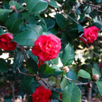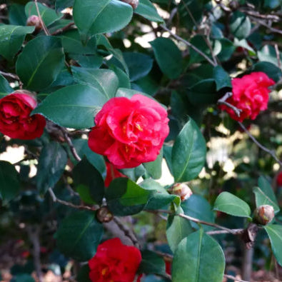 The glorious Camellia japonica Emperor of Russia produces a rich display of dense foliage and extremely large, double, brilliant scarlet flowers with golden stamens amongst twisted, inner petals. A slow-growing, upright evergreen shrub, with a bushy habit, Emperor of Russia is a hardy, long-living plant. Ideal container plant when potted into large pots and tubs, and suitable for screens, hedges and specimen planting.