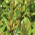 Metrosideros excelsa Dwarf Mini Christmas is a dense, dark green foliaged shrub with red stems. Stunning vibrant orange/red pin-cushion flowers appear during the summer months bringing festive cheer to the garden. A great bird-attracting shrub, Mini Christmas is ideal for hedging and is perfect for screening and coastal landscaping.