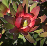 A rounded evergreen shrub, Leucadendron Fantasy Sunset produces deep green foliage with maroon-red new growth and bright red inflorescent flowers, with a subtle hint of blue, in spring. This shrub can be used in mass plantings, general landscaping, native gardens, coastal gardens, rockeries, pots or as a low hedge. It is excellent when used as a cut flower as its stems hold their colour for many weeks.