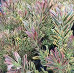 Leucadendron Jester is a spectacular tall shrub with year-round colour. The foliage displays a stunning pink variegation of green, pink and cream which develops a brilliant red flush as the weather cools. Deep red bracts surrounding attractive cone-like flowers top the branches late winter into spring. Plant en masse for an informal screen. Excellent foliage for floral arrangements.