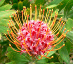 Leucospermum Scarlet Ribbon is a compact, rounded, evergreen shrub with large, salmon-pink flower clusters. Orange stamens rise above a cushion of very showy, glossy, red ribbons from which this flower gains its name. The blooms are produced in such abundance that they cover the plant from late spring to mid-summer. Scarlet Ribbon will attract birds and bees to the garden, and its compact shape makes it ideal for low hedges and borders. It is an excellent cut flower.