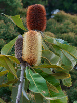 Banksia robur, the swamp banksia, is a dramatic-looking banksia with bright russet new growth, big green leaves, metallic green buds, and impressive gold-tan flower spikes. The hardy native looks good in grouped plantings, wildlife gardens, and along fence lines and driveways. Seed pods are decorative for indoor arrangements as are the banksias themselves. Prune as required to maintain compact growth. Feed with a slow-release native fertiliser during spring.