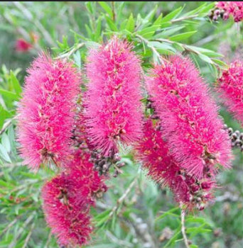 It's a bit of a mystery how Callistemon Lavender Showers got its name, as its bottlebrush blooms are a vibrant hot pink - not lavender! This bushy callistemon flowers in spring and summer, and the flowers provide a striking contrast against the lavender-grey new foliage. Lavender Showers is a fantastic bird-and-bee-attracting native shrub for hedging or borders. Prune after flowering to promote another flush of colour and feed with a native fertiliser annually.