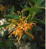 Deau Gold is a compact everblooming grevillea with delightful gold spider flowers. Glossy green leaves are held on graceful arching branches and are covered with masses of flowers for most of the year. Deau Gold is attractive to nectar-eating birds, butterflies, bees and insects. Great specimen or container plant to add year-round interest to the garden.