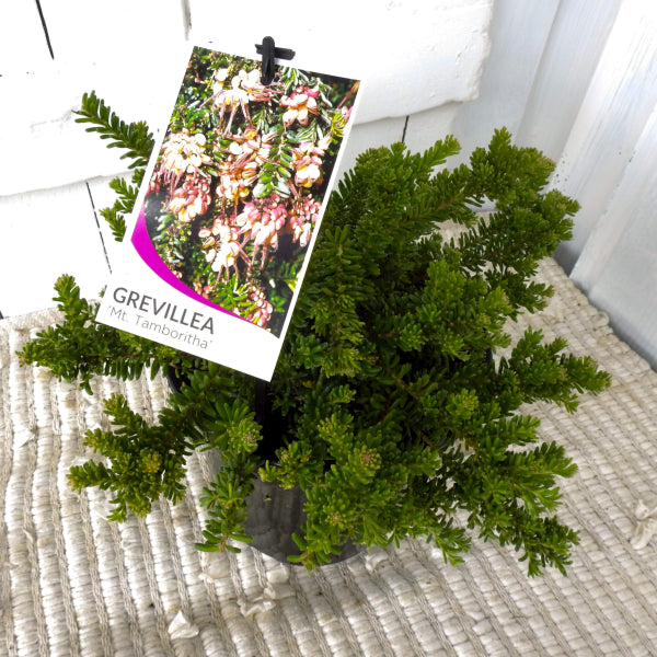 Grevillea Mt Tamboritha is a low-spreading evergreen shrub with dense, dark green foliage. The leaves are narrow and oblong and are arranged spiral-like on arching wiry stems. Each flower head is coloured pink-red and cream, and the blooms are densely crowded onto heads or spikes. The flowers appear primarily from late winter to spring although spot flowering can occur throughout the year. The ornamental foliage, compact form and showy flower clusters make the grevillea ideal for borders, edges, mass-planting, rockeries and embankments.