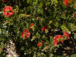 Callistemon Rocky Rambler is a compact groundcover with neat form and fine, almost-spiny foliage which emerges in pale pink fluffy tufts. Rocky Rambler flowers prolifically with bright red brushes attractively tipped in gold, and attracts birds and butterflies. Perfect for landscaping, containers, rockeries, coastal gardens, and as a weed suppressor. An easy care plant, just a quick tip prune once or twice a year is all it needs to encourage a more dense habit and to tidy up old flowers.
