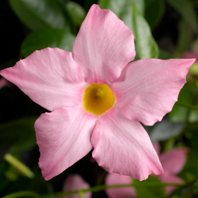 The flowers of the striking evergreen creeper Dipladenia Light Pink will attract hosts of beautiful butterflies to the garden. And as this vine flowers most of the year, your landscape will be a riot of moving colour! Gorgeous grown over trellises, pergolas and balconies, or along wires as a screen, Dipladenia is a fast-growing twining vine with glossy foliage. Leave to ramble over a trellis or sunny balcony for a soft pink flowering display. Prune as required to maintain form and fertilise with a slow-release fertiliser in spring. Provide plenty of water during the summer heat.
