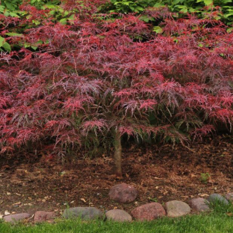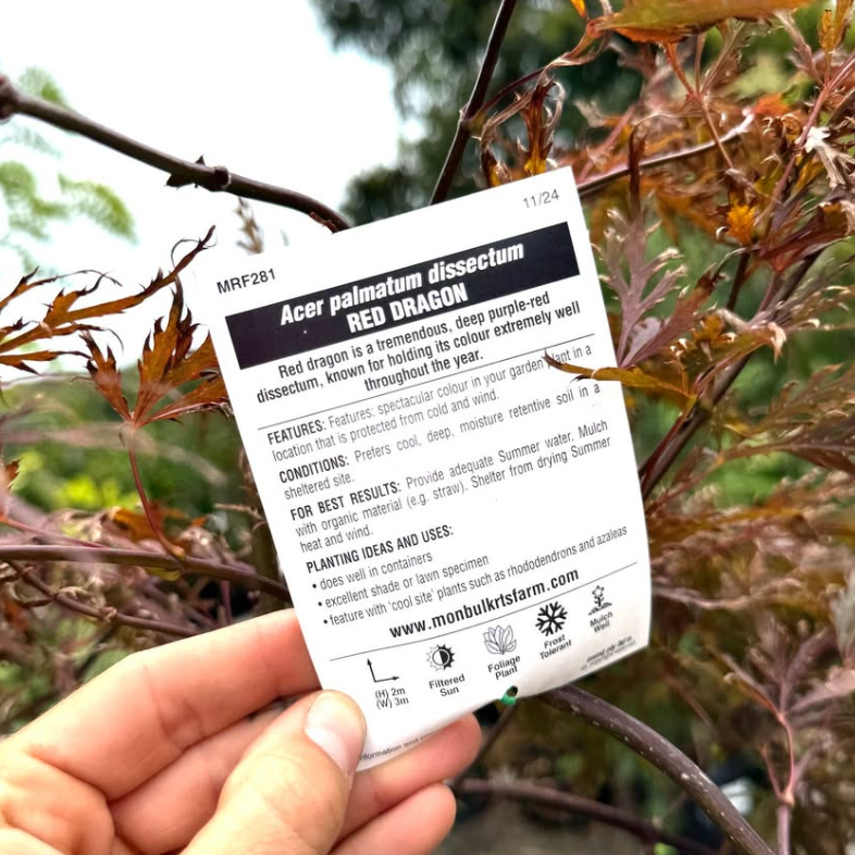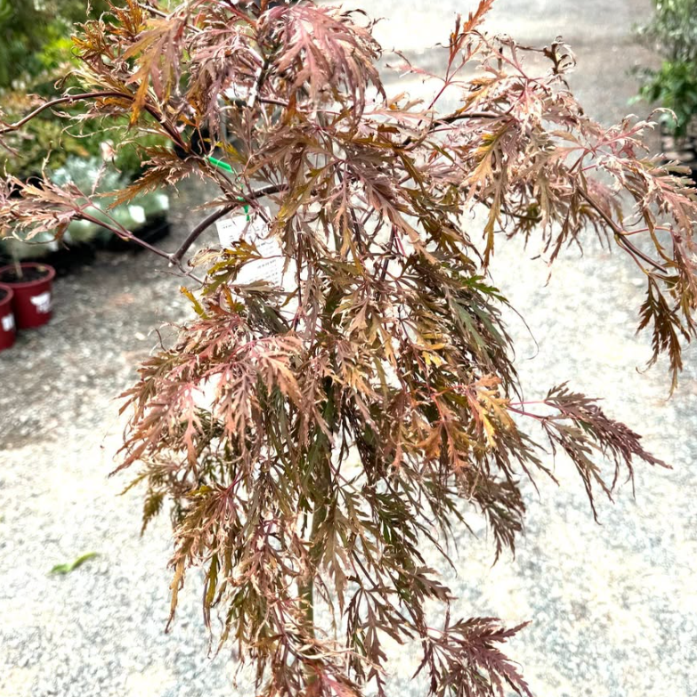 Acer palmatum dissectum Red Dragon is a magnificent weeping Japanese Maple known for its finely cut, lace-like deep red foliage. Unlike other varieties that fade in summer, Red Dragon retains its vibrant colour through the warmer months before turning brilliant crimson in autumn. Its elegant, cascading shape makes it a standout feature in any garden, courtyard, or large container.