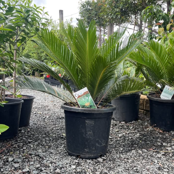 Cycas revoluta, commonly known as the Sago Palm, is a very slow-growing, ancient cycad often described as a living fossil. It features dark green, glossy, feather-like leaves that emerge in a graceful rosette from a rugged trunk, giving it a striking architectural form. This hardy and long-lived species thrives in a wide range of conditions and adds a strong tropical or formal accent to gardens. It makes a stunning specimen plant, whether mass planted, positioned around pools, or showcased in decorative containers where its sculptural beauty can be fully appreciated. Indoors, it is also valued as an easy-care houseplant with bold texture and presence. Take care: The fronds are quite spiky, so avoid planting near walkways.
