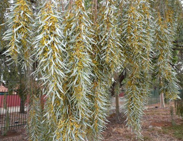 Acacia pendula, known as the Weeping Myall or Boree Wattle, is an incredibly hardy and long-lived wattle from the Fabaceae family. With pendulous spreading branches and small yellow flowers in winter, the beautiful silvery-grey slender foliage hangs down from the branches making it perfect as a medium-sized shade tree in the garden. Underpruning will add to its whimsical nature although it will naturally take on a weeping form. A park bench beneath the tree and some other smaller native varieties planted around it would make for a sophisticated native garden. It is an excellent choice as a street tree or an avenue planting.