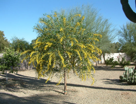 Acacia saligna, native to southeastern Australia, is one of the most popular garden wattles in the country and around the world. This glowing wattle is an undeniably beautiful tree, with its canopy becoming covered in bright golden-yellow blooms in late winter, and delicately papery foliage that rustles in the slightest wind. The fast-growing decorative wattle is ideal for parks, gardens, re-vegetation projects and is excellent for erosion control in coastal areas. Prune after flowering to increase longevity.