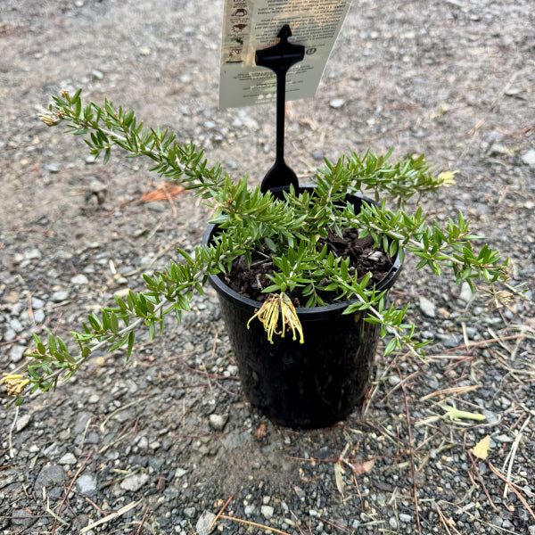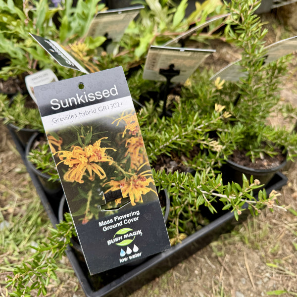Grevillea juniperina x rhyolitica ‘Sunkissed’ is a compact, evergreen shrub that produces a stunning display of golden-orange flowers throughout the year, attracting birds, bees, and butterflies. With its fine, needle-like foliage and naturally dense, mounding habit, ‘Sunkissed’ is ideal for low hedging, rock gardens, native gardens, and containers. This tough and drought-tolerant grevillea thrives in full sun to part shade, requiring minimal maintenance while adding vibrant color to any landscape.