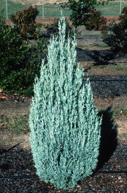 Naturally upright in growth habit, Juniperus scopulorum Blue Arrow is a conifer that is an alternative to the common pencil pine. A hardier option than the Italian Cypress, Blue Arrow has rope-like ascending foliage that is coloured a striking blue-grey. It is a great plant for confined spaces where you wish to add some height, and with such good foliage year round it can also be used as a structural plant. Try it either side of a pathway, entrance or as a focal point in the garden. It is recommended to mulch well to help retain moisture in summer.