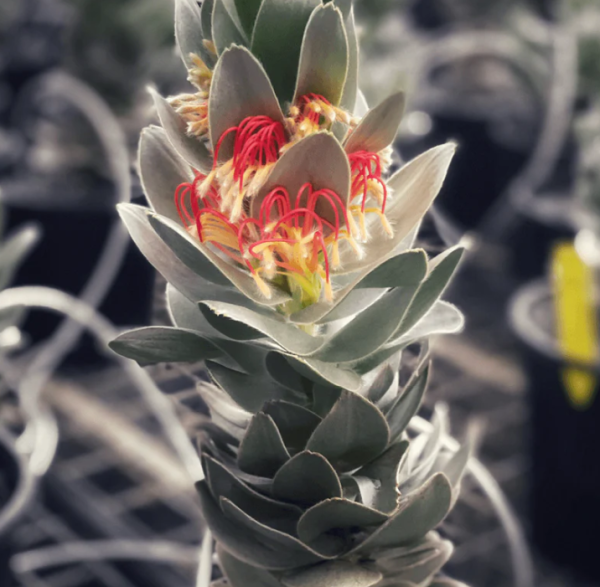 Mimetes Crackerjack Silver is a rare and critically endangered plant originating in the misty heights of Kogelberg's mountains in Africa. The unique hardy shrub is adorned with velvety silver leaves and contrasting vibrant red flowers - a feature piece in your summer garden! This plant is versatile and can be used for mass plantings, general landscaping, native gardens, coastal gardens, rockeries, pots, or as a low hedge. Additionally, Crackerjack Silver is an excellent choice as a cut flower, as its stems hold their colour for many weeks.
