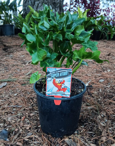 Philodendron 'Super Atom' is a compact, hardy philodendron renowned for its extremely ruffled, glossy green leaves. This plant is perfect for adding lush, tropical greenery to both indoor and outdoor settings. Ideal for use as a feature plant in rockeries or under trees and shrubs, it also thrives in pots. 'Super Atom' brings a touch of the exotic to any space while being easy to care for, making it a favourite among plant enthusiasts.