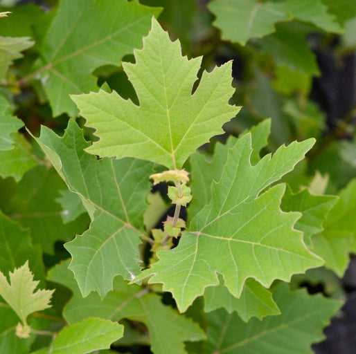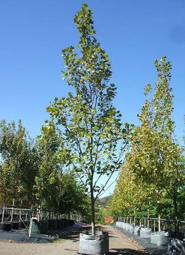 Platanus x acerifolia, or London Plane Tree, is an impressive ornamental specimen with generously large, bright green foliage resembling maple leaves. A great feature of the tree is its bark which is a smooth cream colour attractively blotched with grey and brown. Brown seed balls hang like ornaments in winter. Commonly planted as a street tree and in avenues because of its tolerance to heat and pollution.