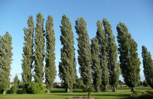 Populus nigra Italica, known as Lombardy Poplar, is a large, narrowly columnar deciduous tree with a high tolerance to exposure. Crimson male catkins appear before the leaves open in early spring. The leaves are diamond-shaped and begin life as a glowing bronze, mature to bright green and finally age to a brilliant gold in autumn. The Lombardy Poplar is a tall and vigorously-growing tree, and is often seen lining country roads, driveways and avenues, and in paddocks where it acts as a useful windbreak.