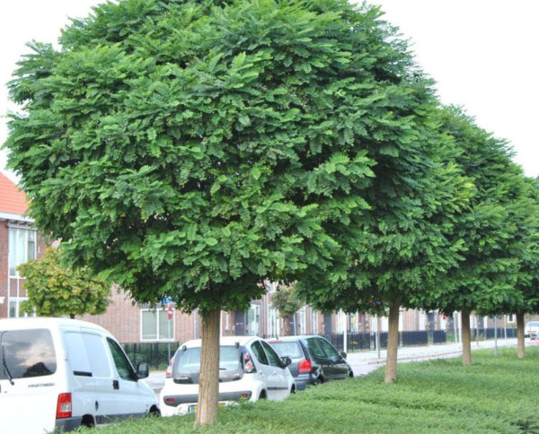 Robinia pseudoacacia Umbraculifera, or Robinia Mop Top, is a naturally topiarised, thornless tree with a compact, rounded canopy grafted onto a straight trunk. Mop Top requires very little maintenance to maintain a lovely classical manicured look. Foliage is bright green turning yellow in autumn, with long, fragrant white flowers appearing in late spring/summer, followed by reddish-brown pods. It is ideal for planting in confined areas as a feature tree or for creating avenues where conventional trees won’t fit.
