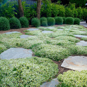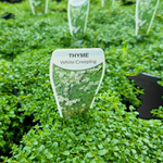 Thymus serpyllum Albus, or Creeping White Thyme is a low-growing and strongly scented perennial with dense foliage and a compact growth habit. One of the most intriguing modern uses of creeping thyme is as a lawn substitute. Creeping White thyme helps to support native bees thanks to its prolific nectar-rich flowers and its ability to withstand light foot traffic. It is a beautiful Mediterranean herb suited to rockeries, border edges and container gardens, and it can even thrive in balcony gardens. Thyme can be used at all stages of cooking: early for strong flavour in soups and casseroles, late for stir fries and salads or as a garnish for any savoury dish.